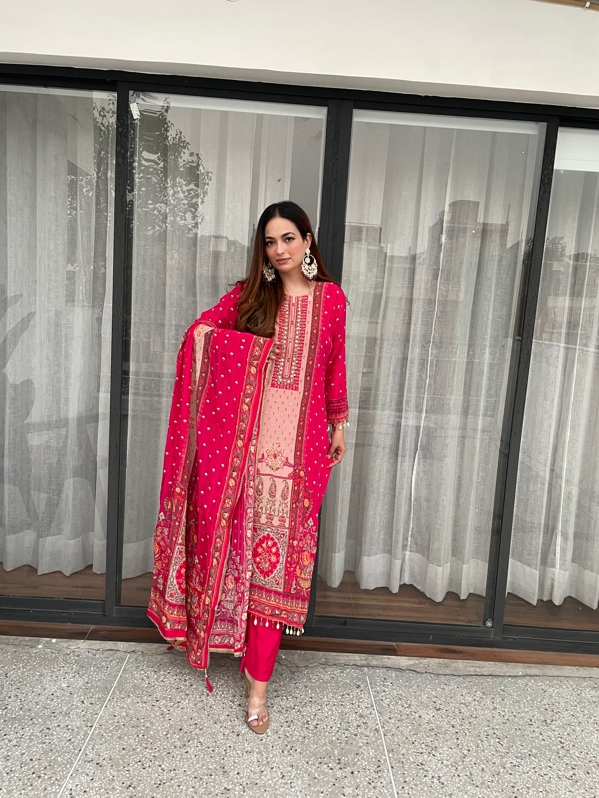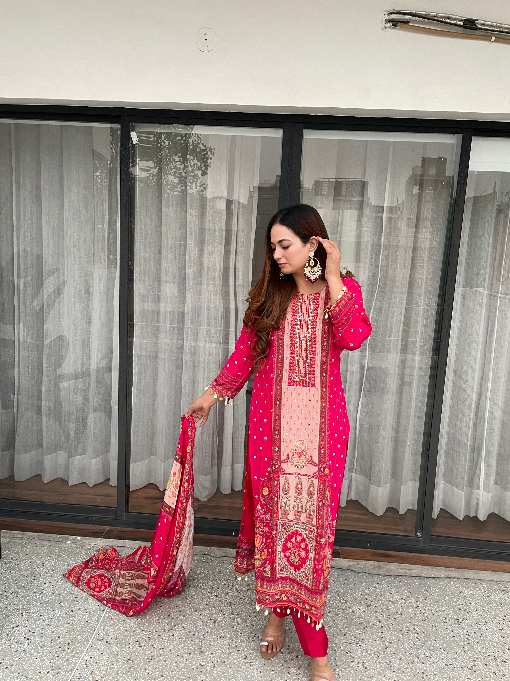 Hot Pink Embroidered Suit Set with Printed Dupatta