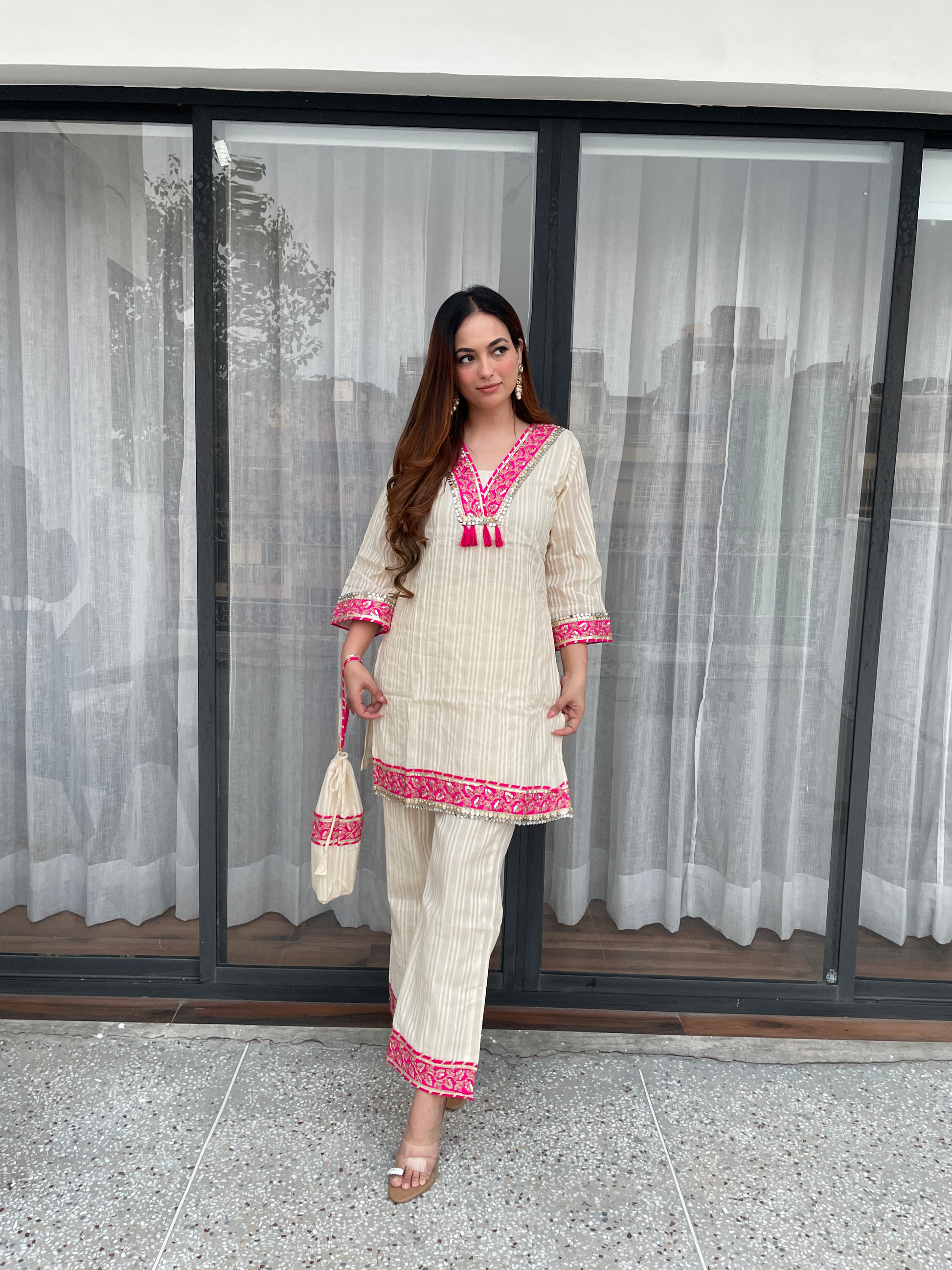 Radiate subtle elegance with our Cream Embroidered Cord Set, a seamless blend of traditional craftsmanship and contemporary charm. The kurta showcases fine pink thread embroidery along the neckline, sleeves, and hem, beautifully complemented by intricate border detailing that enhances its refined silhouette. Designed in soft, breathable cotton fabric, it ensures all-day comfort while maintaining a luxurious appeal. Paired with matching straight-fit pants and a coordinated embroidered potli bag, this ensemble is the perfect choice for festive gatherings, family celebrations, or graceful daytime occasions. Step into understated sophistication where comfort and style come together effortlessly. 🤍🌸✨