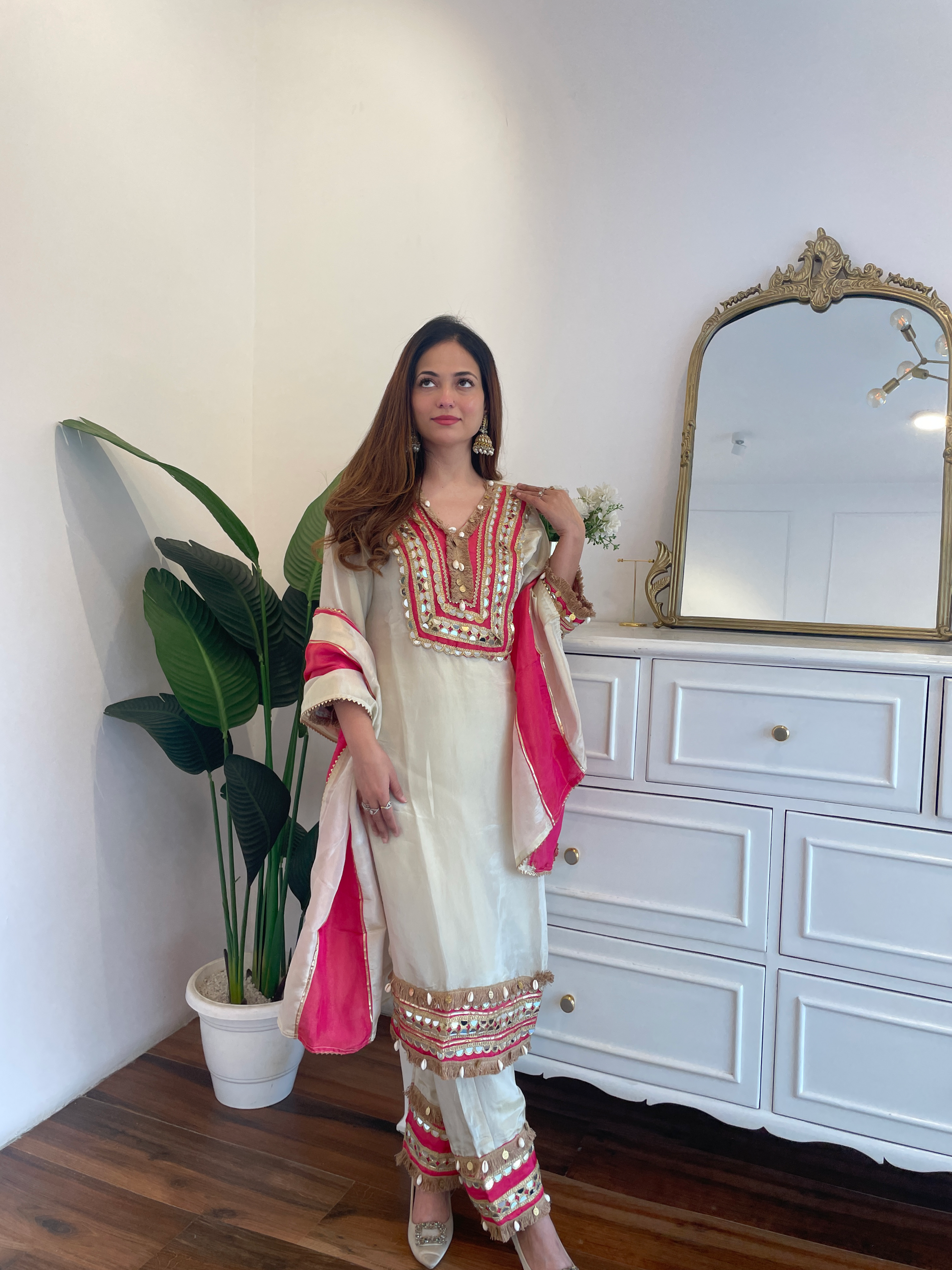 Radiate refined grace with our Cream Mirror Embroidered Suit Set, a perfect fusion of traditional craftsmanship and modern sophistication. The kurta features intricate mirror and gota work along the neckline, sleeves, and hem, accentuated with vibrant pink detailing that adds a festive charm. The straight-cut silhouette offers a flattering and elegant drape, while the matching trousers adorned with coordinating mirror embellishments elevate the ensemble’s regal appeal. Paired with a soft dual-toned dupatta in cream and pink hues, this outfit beautifully balances vibrancy and subtlety. Crafted from premium, breathable fabric, it ensures comfort without compromising on elegance. Ideal for festive occasions, family gatherings, or celebratory daytime events, this set embodies timeless beauty with a contemporary twist. ✨🌸💗