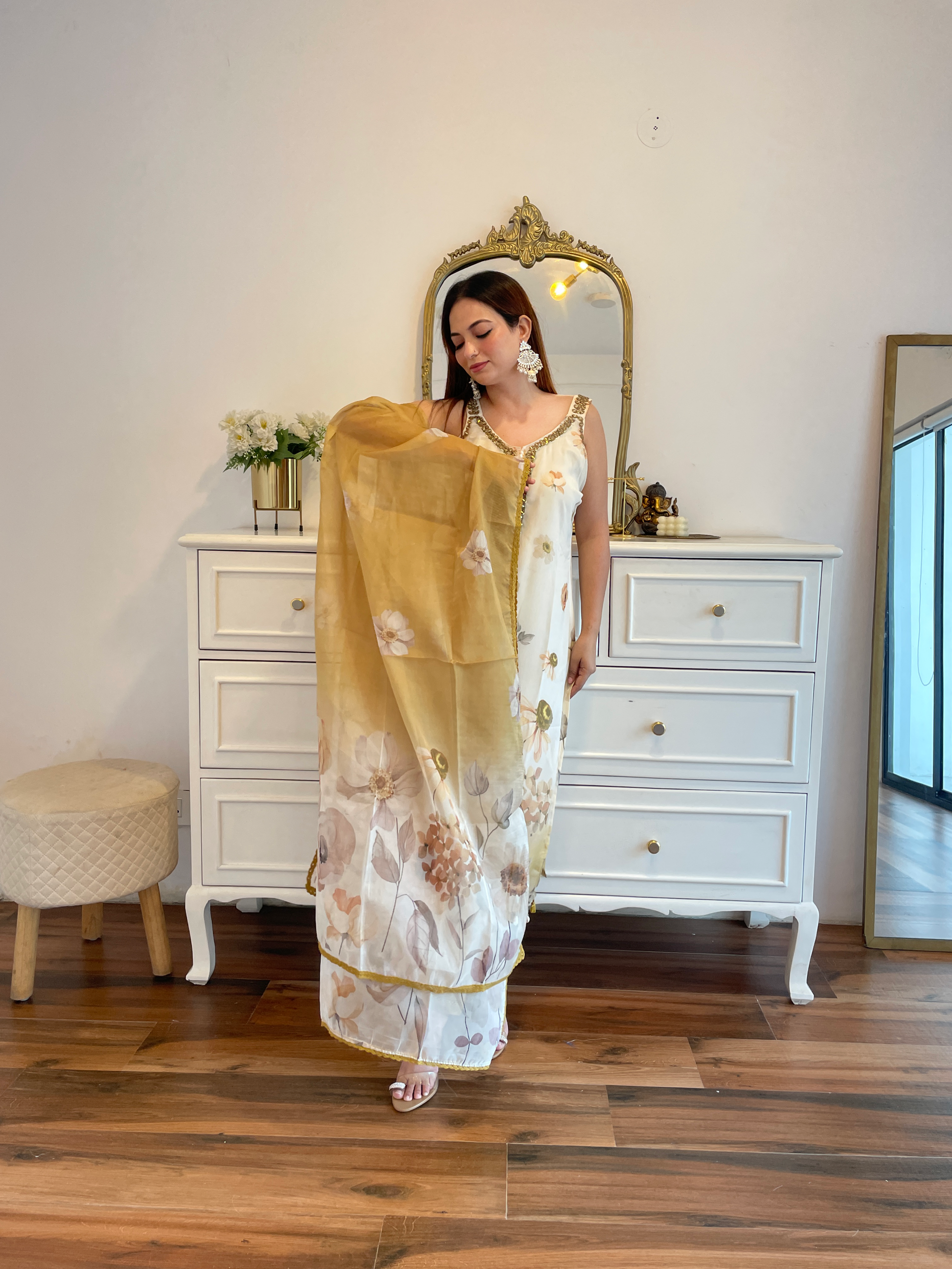 Mustard Floral Printed Suit Set with Mirror Work & Organza Dupatta