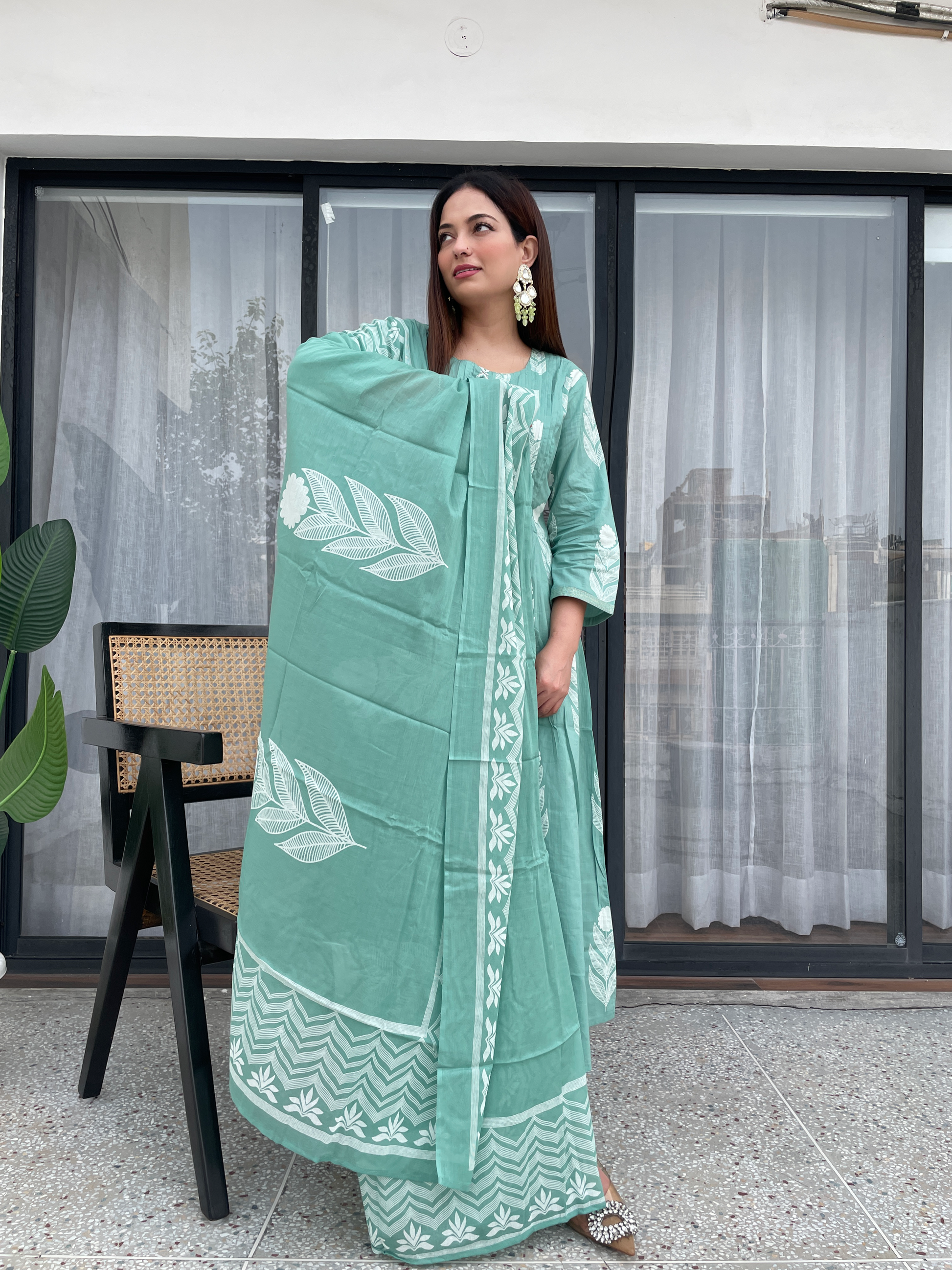Pastel Mint Green Printed Kurta Set with Pants & Dupatta